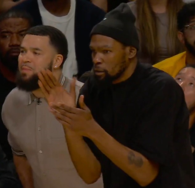 兄弟们冲!杜兰特和范弗里特化身啦啦队 在场边加油鼓劲